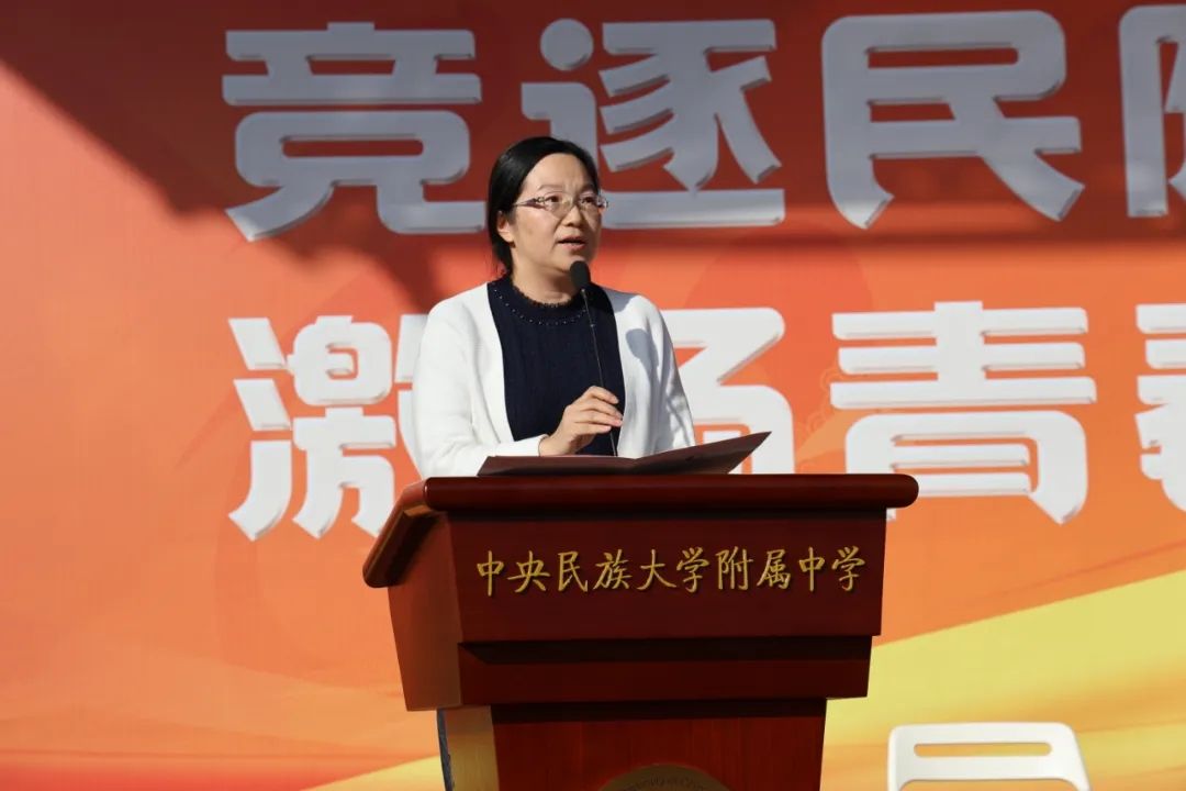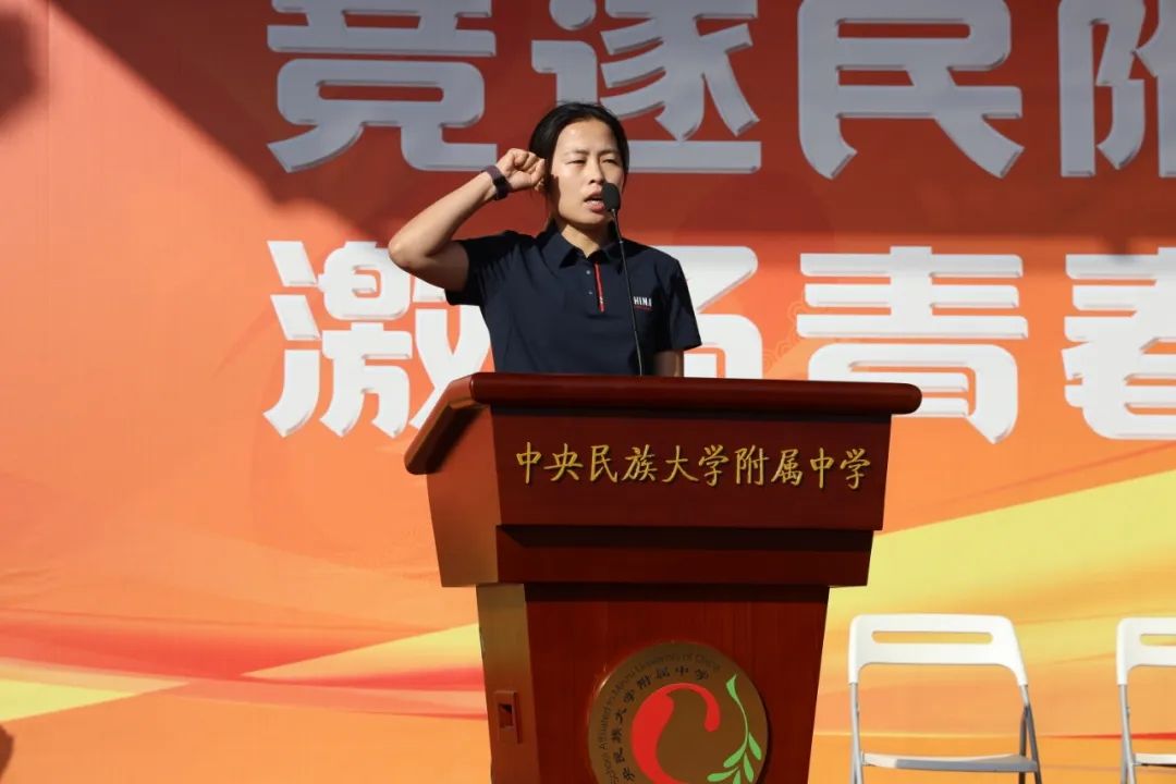 校长助理韩秀清致开幕词。她指出,本届运动会恰逢“民族团结进步宣传月”,体育不仅是体能的锻造,更是精神的熔铸。她进一步强调,学校始终牢记“为党育人、为国育才”的初心使命,将体育作为立德树人和铸牢中华民族共同体意识的重要载体。 她勉励全体运动员发扬奥林匹克精神,赛出风格、赛出水平,将赛场上的拼搏转化为成长的力量,并希望同学们通过体育竞技,深刻体会“各美其美、美美与共”的校训内涵,将团结协作、尊重对手的体育品格融入日常,凝聚起蓬勃的青春力量。