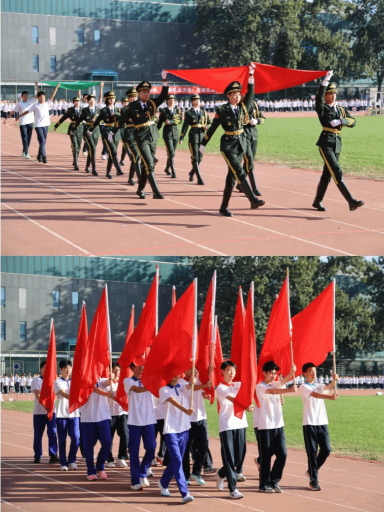 国旗方阵、校旗方阵、红旗方阵依次入场,步伐坚定,气势如虹。