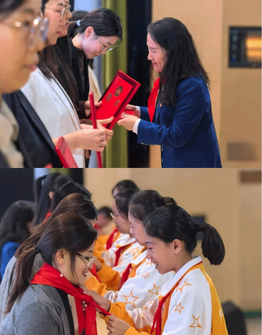 党委常务副书记佟丽娟为校内外辅导员们颁发了聘书,少先队员代表为辅导员老师们佩戴上鲜艳的红领巾。