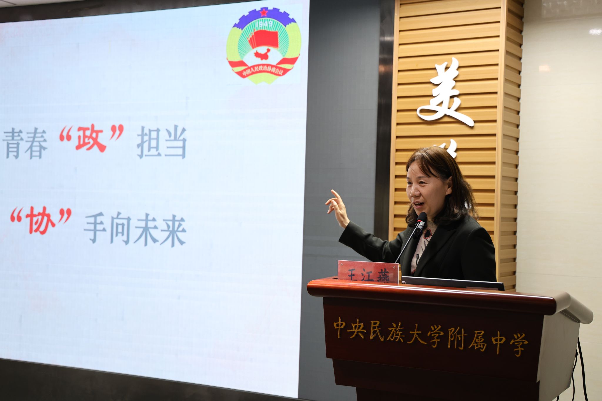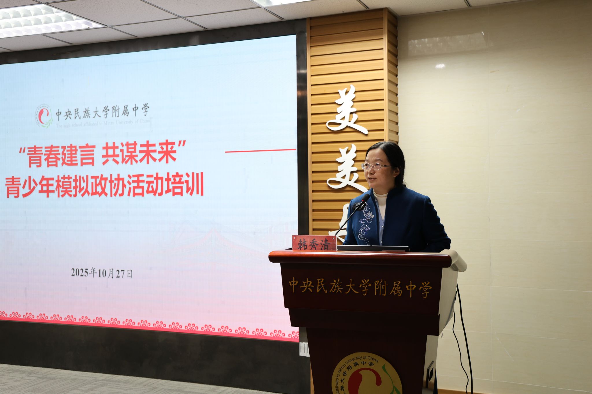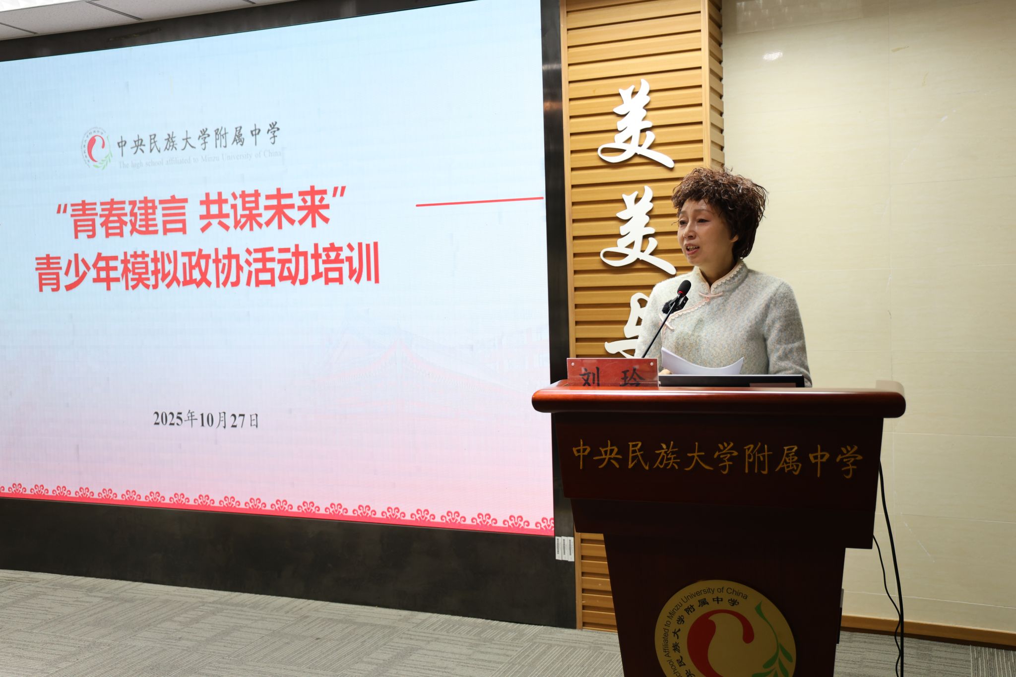 为引导青少年深入了解中国特色社会主义民主政治,提升学生社会观察力与建言能力,在海淀区政协、海淀区教委的大力支持下,2025年10月27日下午,中央民族大学附属中学成功举办“青春建言 共谋未来”青少年模拟政协活动培训会。海淀区政协副秘书长、委员工作室主任、二级巡视员刘玲,中央社会主义学院统战理论教研部、统战理论与政策教研室副教授王江燕,海淀区政协委员工作室李昂走进学校调研指导工作,与民大附中师生代表共话模拟政协意义,共绘成长蓝图。民大附中党委常务副书记佟丽娟会前陪同区政协领导、专家参观校史馆。德育科、教科室、团委等部门干部及思政课教师代表、学生代表参加了此次活动。