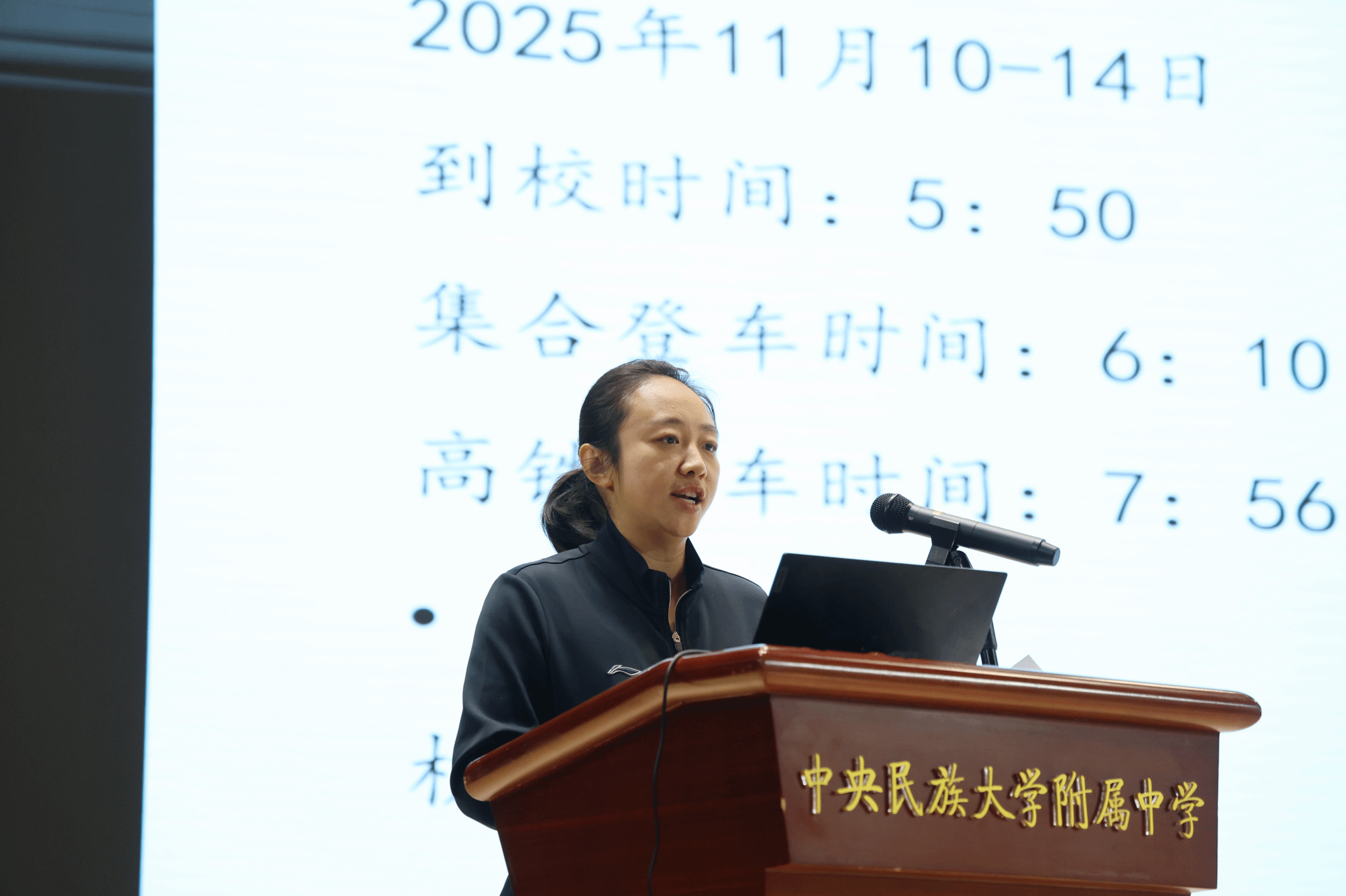 2025年11月6日,中央民族大学附属中学初二年级“人文浸润承薪火,科创领航向未来”杭州研学行前说明会在学校举行。会议由年级主任法旭老师主持,全体初二师生共同参与,明确了行程安排与纪律要求。