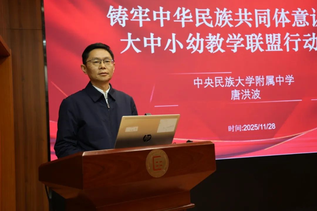 中央民族大学附属中学党委副书记、校长唐洪波详细介绍了联盟的工作职能与成员单位。他表示,联盟将聚焦“中华民族共同体意识入脑入心”核心目标,推动建立大中小幼纵向衔接机制,实施跨学段、跨学科联合教研。联盟将系统推进课程建设,全面提升幼儿园《中华民族一家亲》、小学《中华民族大家庭》、中学《中华民族大团结》等课程质量,构建“五个认同”递进式教学目标体系,形成“五融五学”教学体系,强化教学资源共建与教师培训。