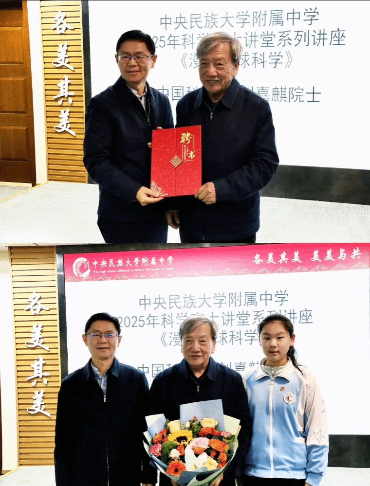 中央民族大学附属中学党委副书记、校长唐洪波,校长助理韩秀清出席了本次活动,为刘嘉麒院士颁发了聘书,2025级英才班学生代表为刘嘉麒院士献花并赠送了纪念品。唐校长表示,期待通过刘院士的专业引领,进一步提升学校科学教育的高度与深度,让学生能够站在“科学家的肩膀上,眺望星辰大海。”