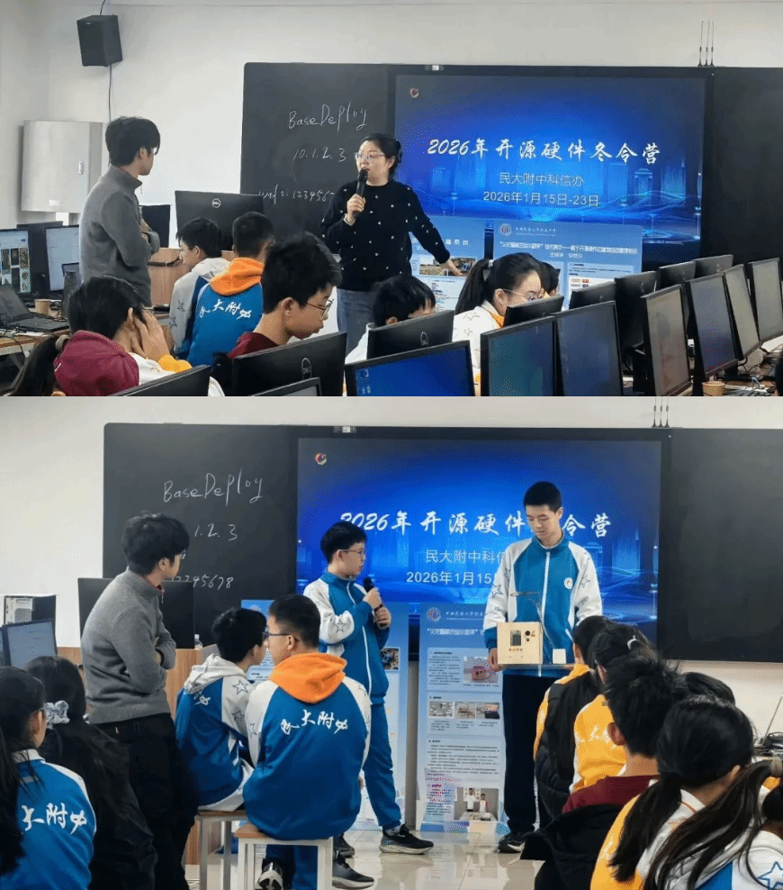 寒冬启智,科创筑梦。近日,2026年初中部开源硬件创意智造冬令营圆满落下帷幕。34名怀揣科技梦想的初一、初二学子,分成14个小组并肩作战,历经数日的沉浸式学习与实践,最终成功孵化出11组兼具创意与实用性的智能硬件作品,用热爱与坚持书写了一场精彩的科创之旅。