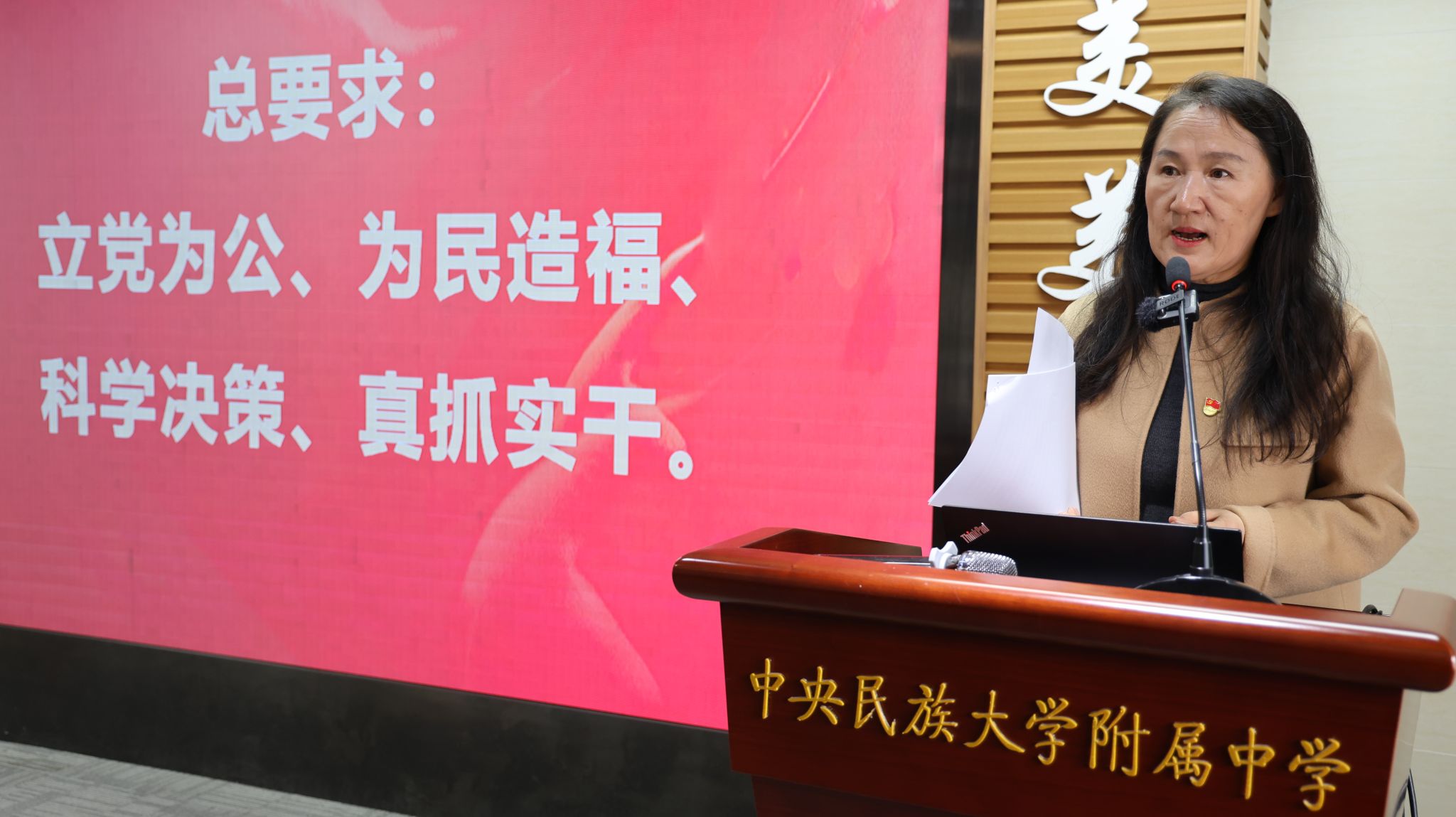 党委常务副书记佟丽娟解读了《中共中央民族大学附属中学委员会开展树立和践行正确政绩观学习教育实施方案》,并依据学习教育任务清单作出了具体部署。她强调,要紧扣“立党为公、为民造福、科学决策、真抓实干”总要求,坚持学查改一体推进,将学习教育与学校铸牢中华民族共同体意识教育、师资队伍建设、校园治理等中心工作深度融合,确保学习教育不走过场、取得实效。
