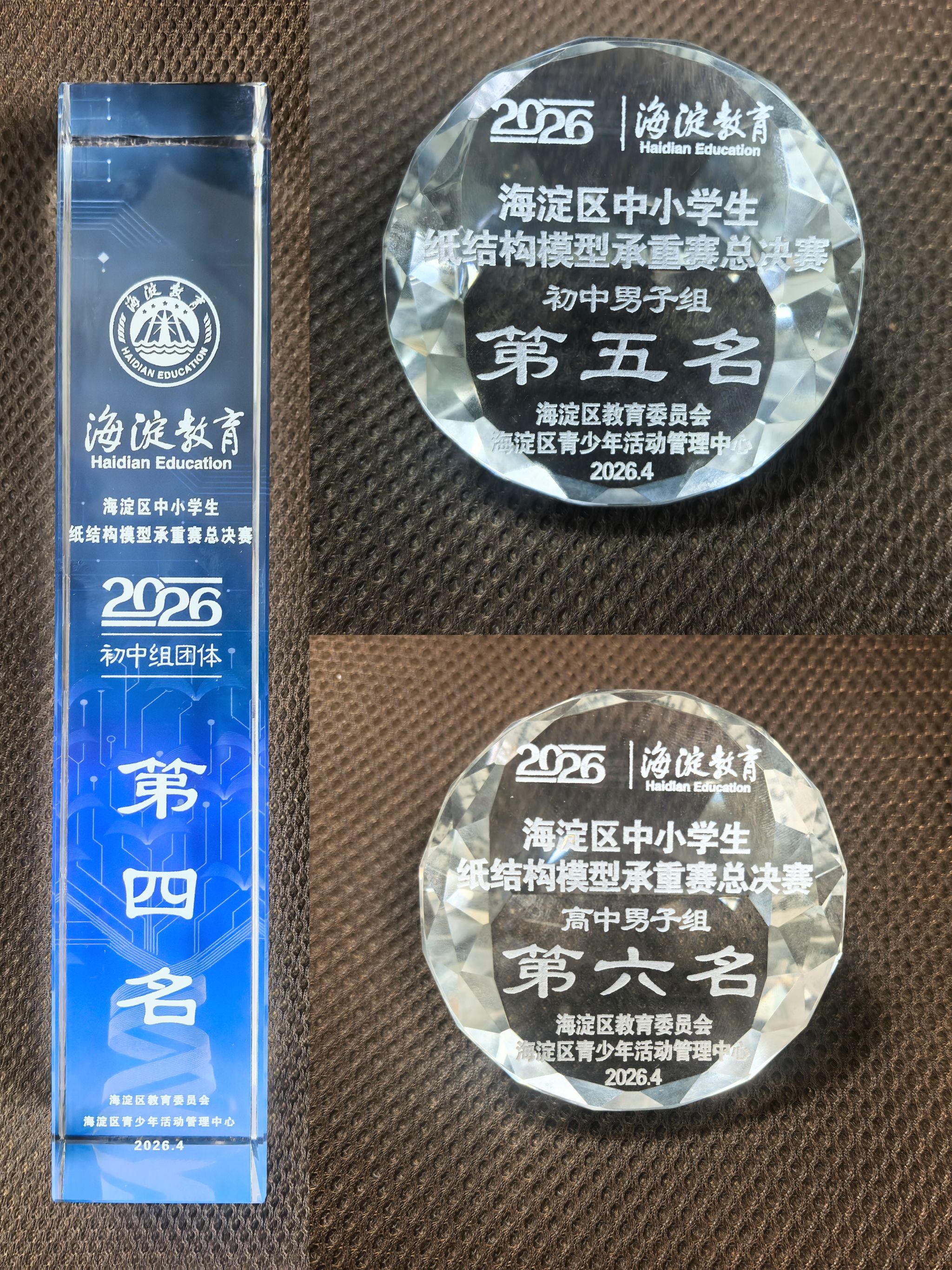 王若水同学说道:“这次参加海淀区纸结构承重大赛,我和队友们一起反复讨论、不断修改设计,从一次次失败中总结经验,最终拿到了团体第四名。虽然没能站上更高的领奖台,但这个成绩已经让我们很有成就感。比赛中,我们不仅锻炼了动手能力和创新思维,更体会到了团队协作的重要性。每一次粘贴、每一次调整,都是大家共同努力的结果。‘路虽远,行则将至;事虽难,做则必成。’这次经历让我收获颇丰,也激励我在今后的学习和活动中更加认真、更加坚持,争取下次取得更好的成绩。”