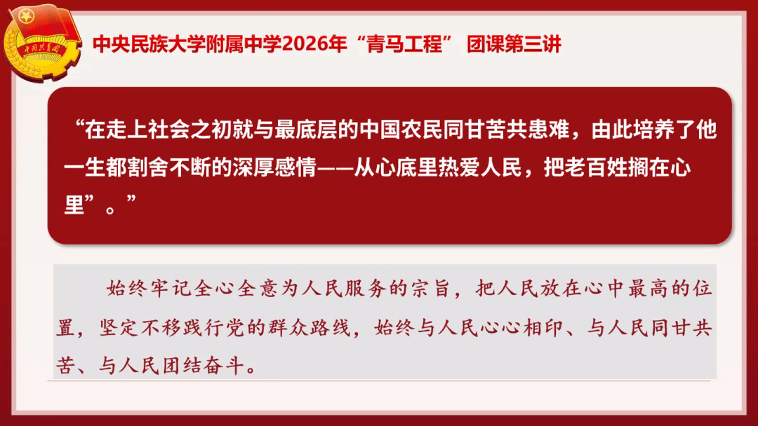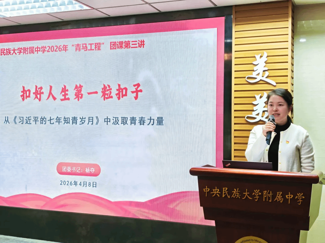 2026年4月8日,中央民族大学附属中学2026年“青年马克思主义者培养工程”培训班暨“薪火”读书班第三讲主题团课于学校报告厅隆重举行。校团委书记杨夺以“扣好人生第一粒扣子——从《习近平的七年知青岁月》中汲取青春力量”为题,为全体学员带来一堂兼具思想深度与情感温度的思政课。