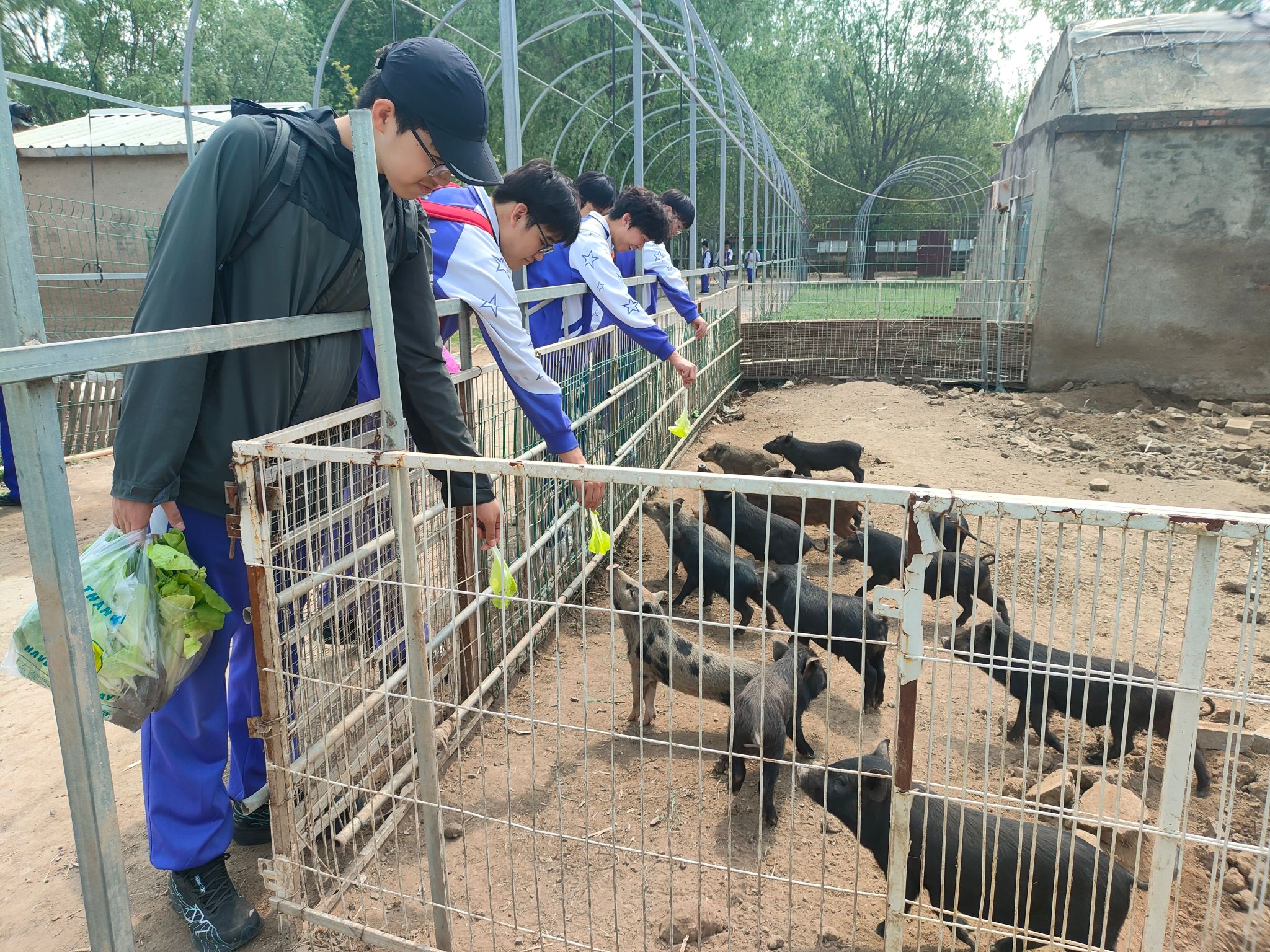 在“爱心饲养员体验”喂养环节,同学们化身超级饲养员,用采摘的快菜投喂农场家禽家畜,细致观察动物进食状态,在互动中体验饲养员的责任与快乐。