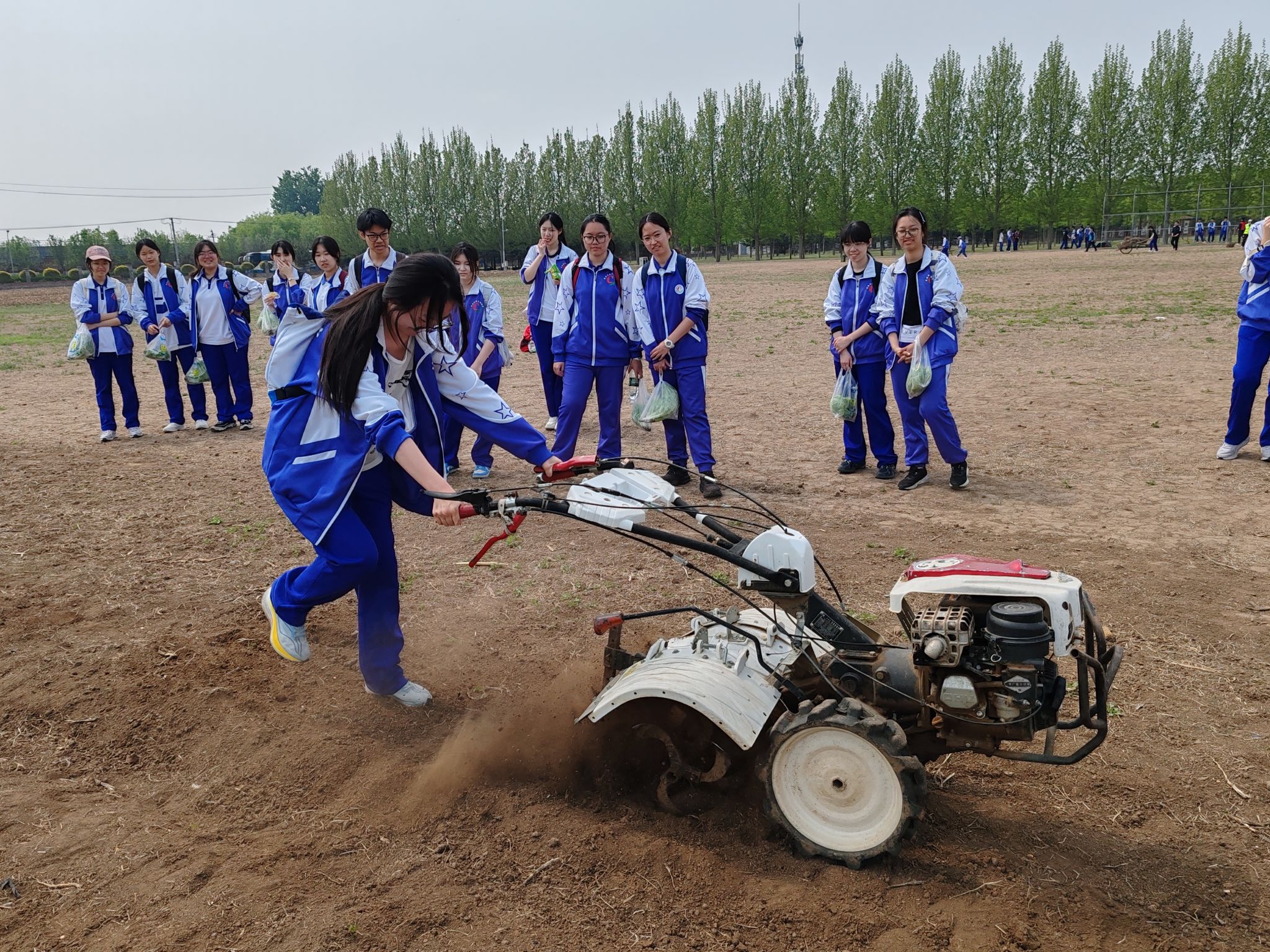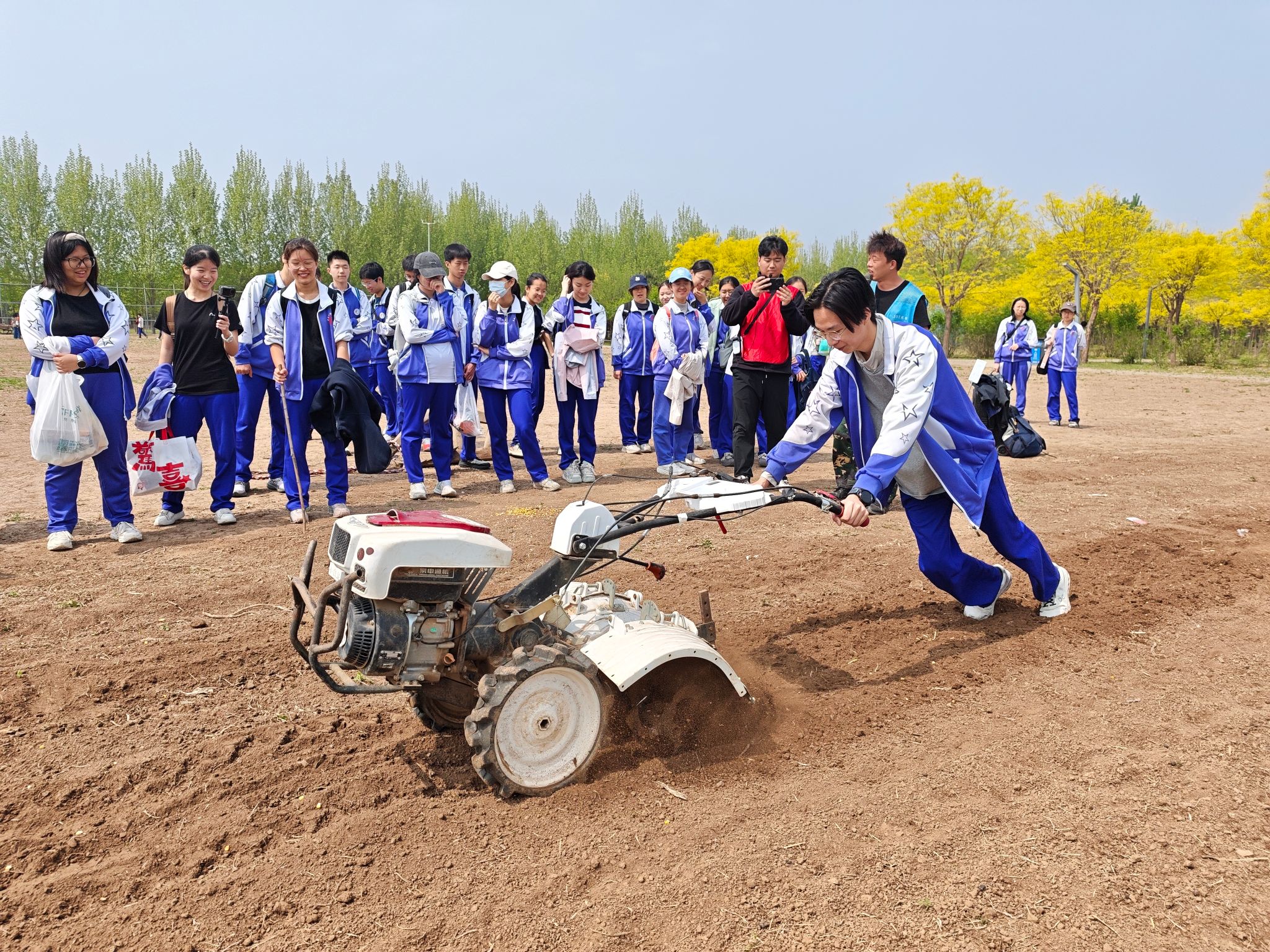 本次活动针对高二学生认知特点,设计了进阶式劳动实践体系。在“科技赋能农耕”旋耕机体验区,同学们在专业指导下观摩农机作业、学习操作原理,亲手操控机械完成垄沟翻整,在现代农业技术与传统耕作的碰撞中感受科技兴农的力量。