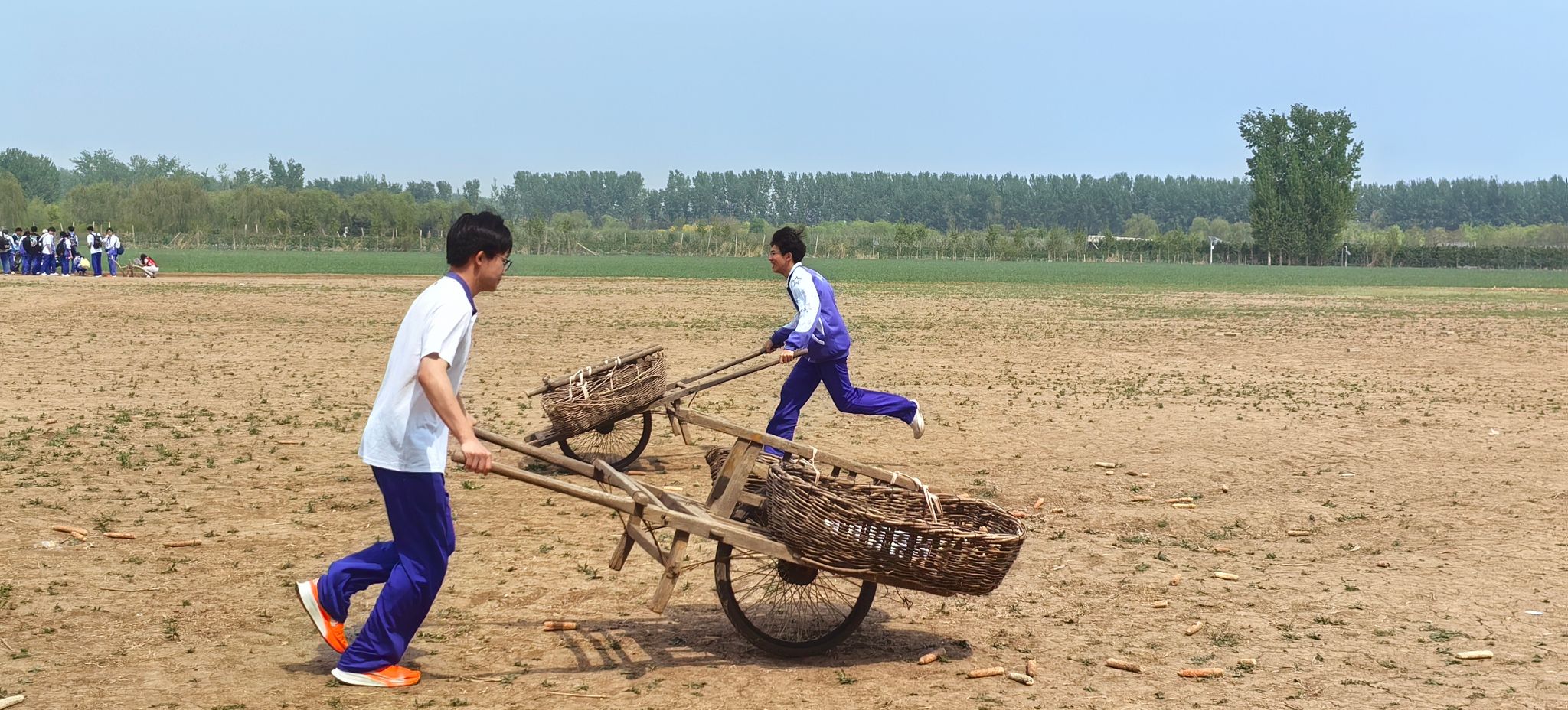 本次活动围绕“长征胜利90周年”主题,设计了沉浸式红色教育模块。在“自力更生显担当”小推车运秋粮环节,同学们小组接力,协同作业,规划路线运力与装载策略,用简陋小推车复刻“南泥湾扁担竹筐”的物资转运智慧,在急转弯的粮道上体验秋收运输的辛劳与智慧,深刻领会自力更生的南泥湾精神和长征后勤保障的艰辛与高效。