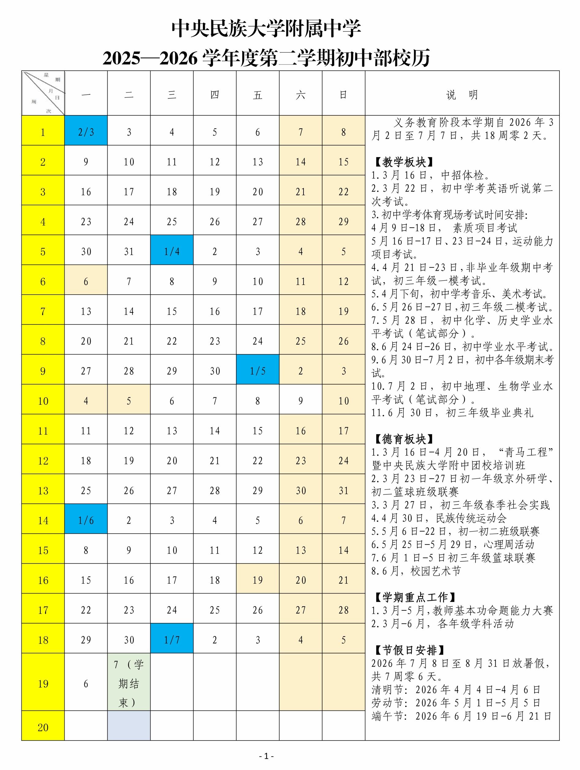 中央民族大学附属中学2025-2026学年第二学期初中部校历