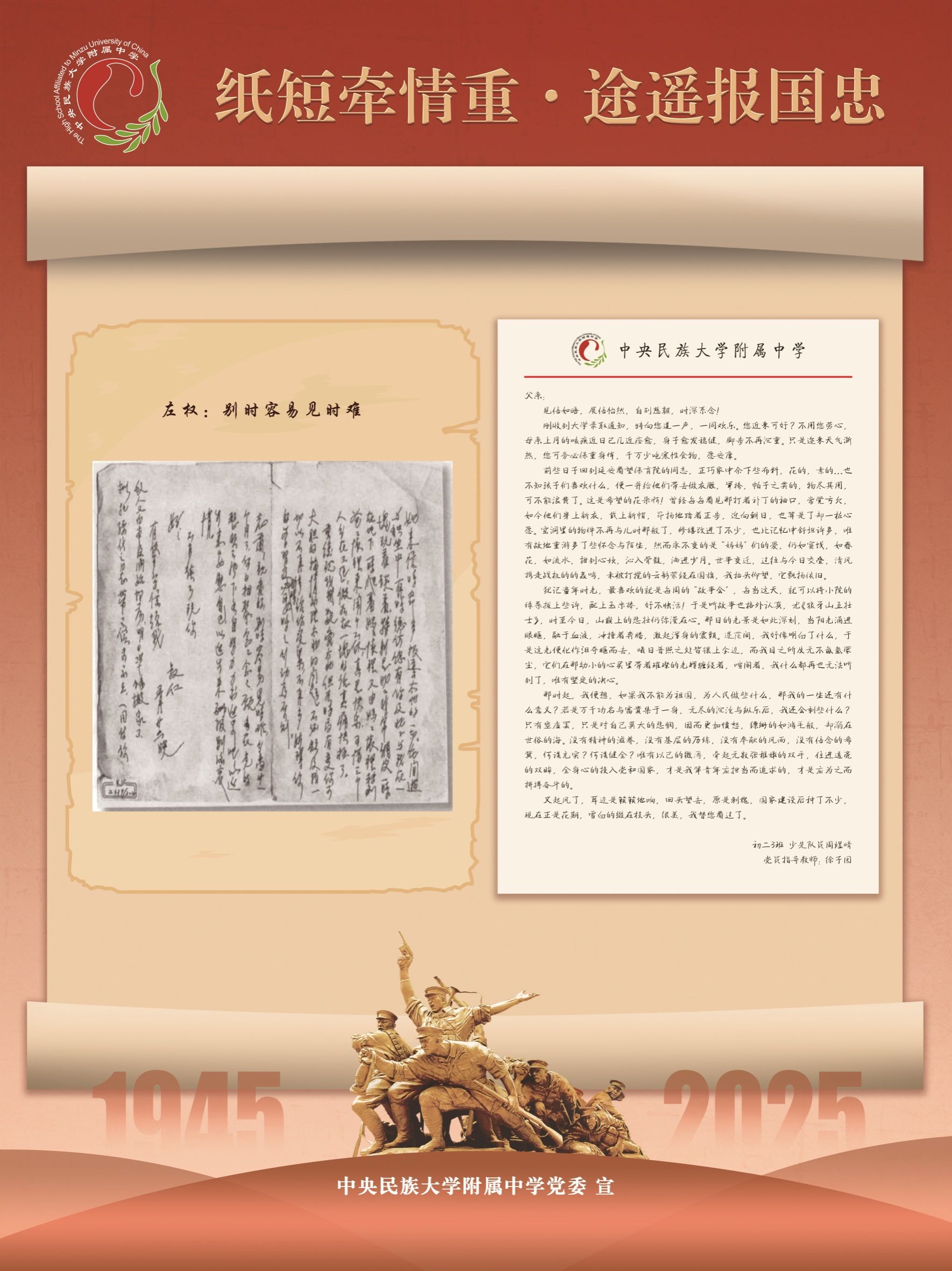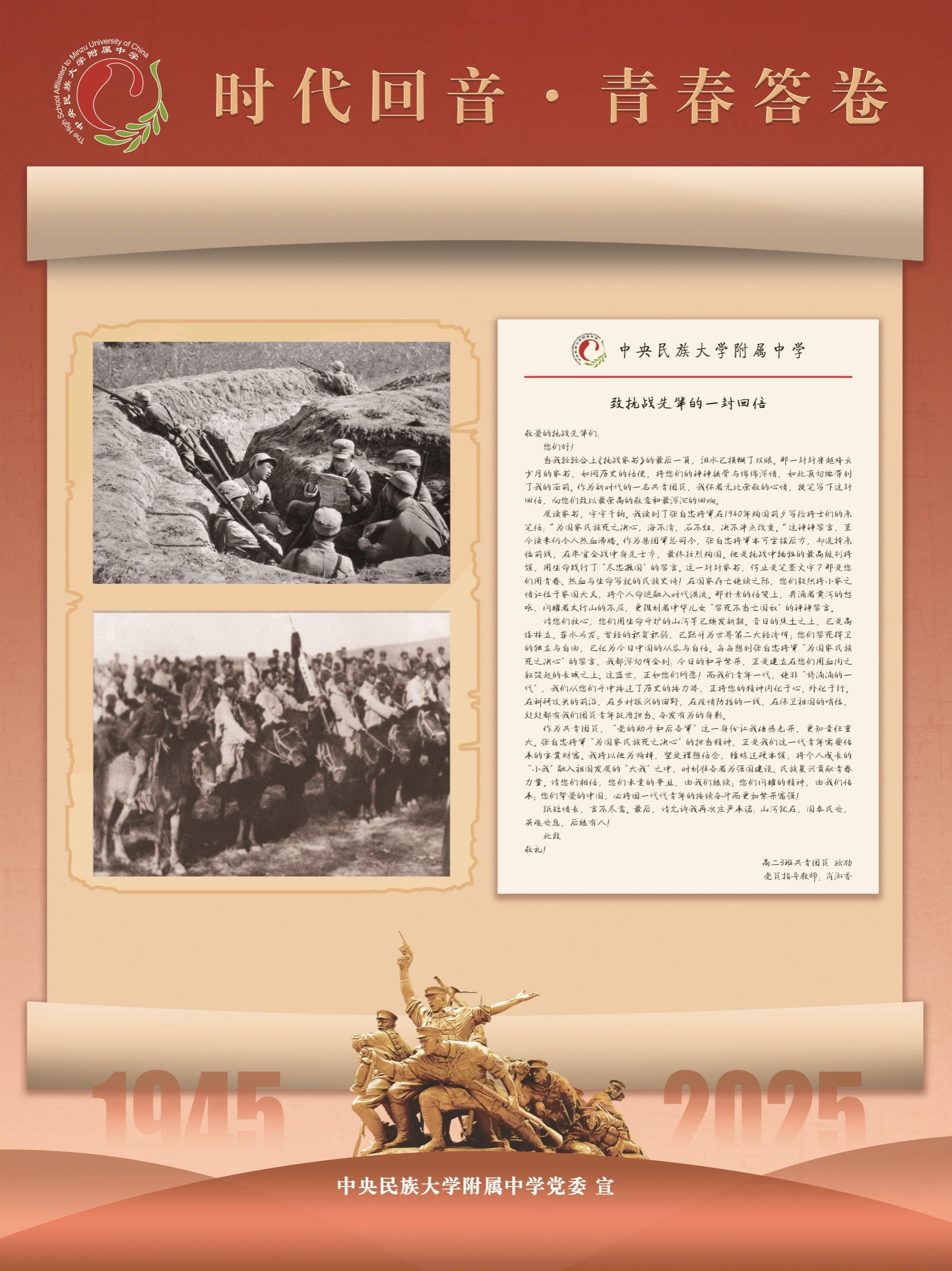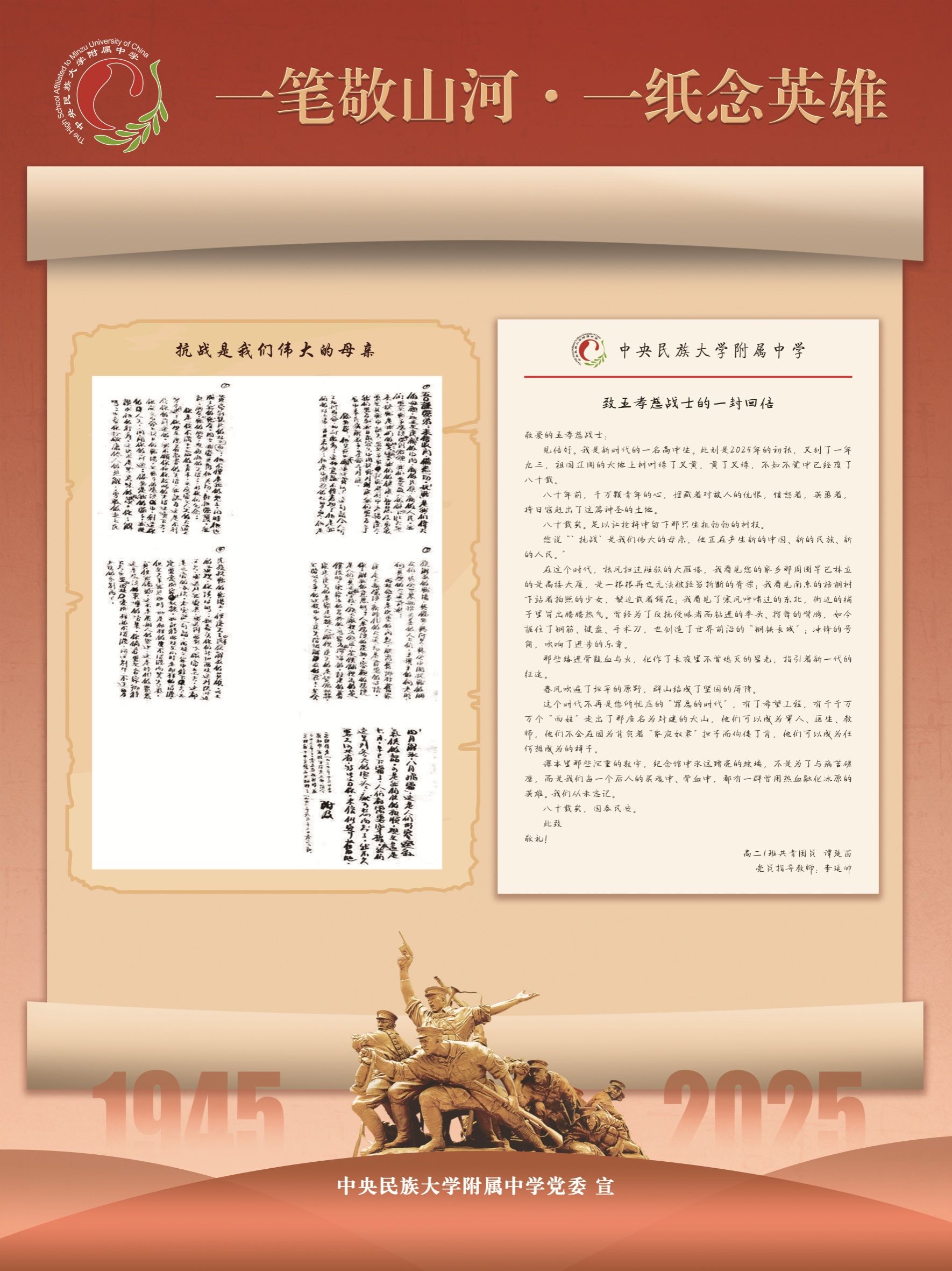 在深入共读阶段,各共读小组围绕“如果我在那个年代”主题,撰写致抗战先辈的回信,党委制作成致敬英雄回信主题展在民大附中各校区展出;同时创排3分钟红色家书诵读视频,以艺术化形式再现烽火岁月中的家国情怀。