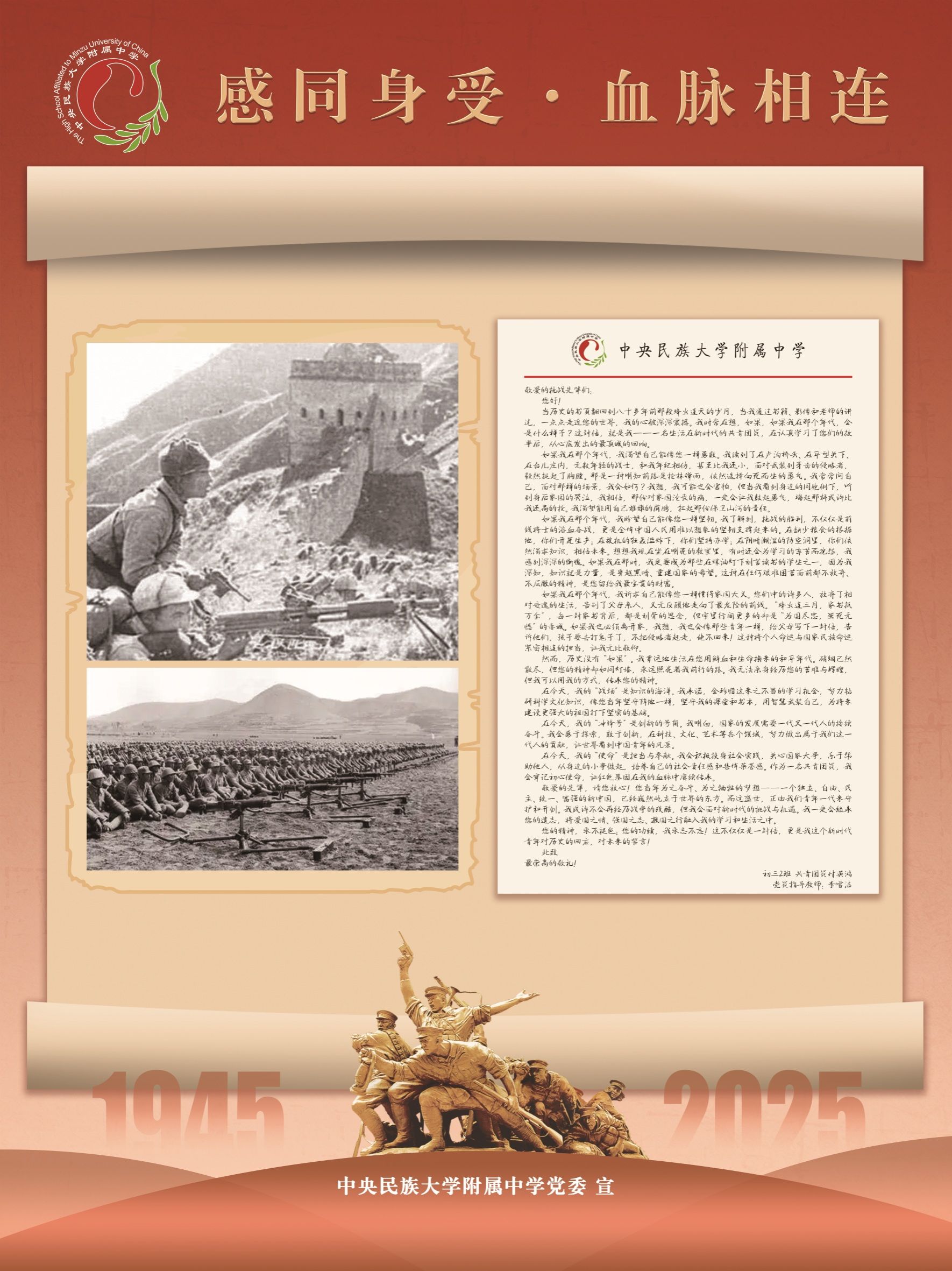 在纪念中国人民抗日战争暨世界反法西斯战争胜利80周年之际,中央民族大学附属中学党委深入贯彻落实习近平总书记关于“用好红色资源,赓续红色血脉”的重要指示精神,于2025年9月、10月组织开展了“重温抗战家书·传承红色基因”师生共读《抗战家书》主题学习活动。本次活动以党团队一体化建设为牵引,通过党员引领、团队联动、师生共融的方式,推动红色教育入心入脑,实现了思政育人成效的全面提升。