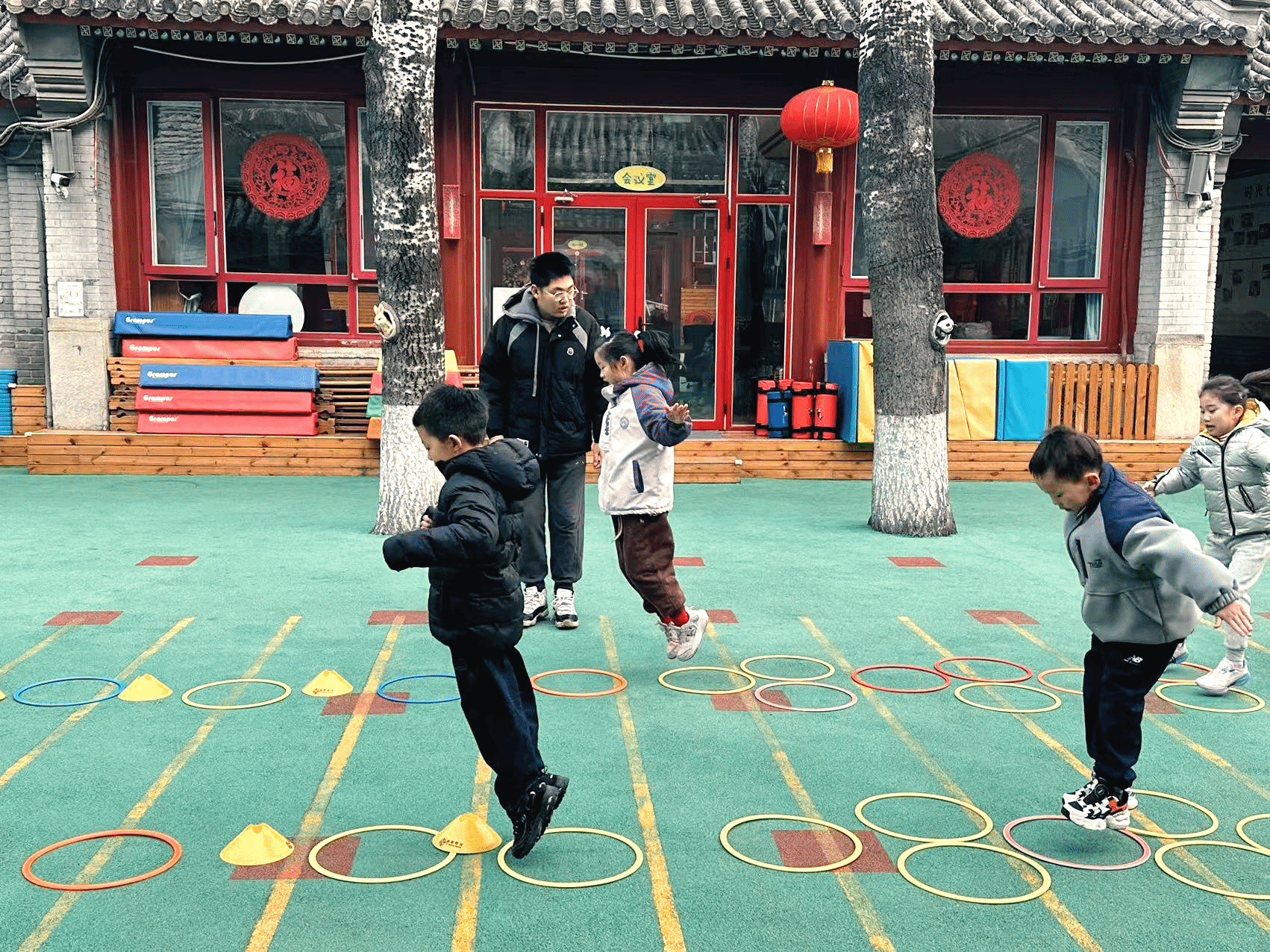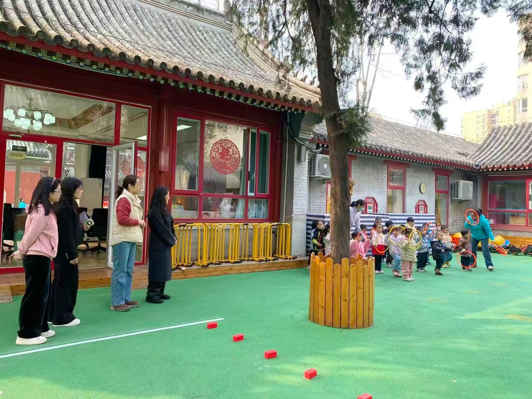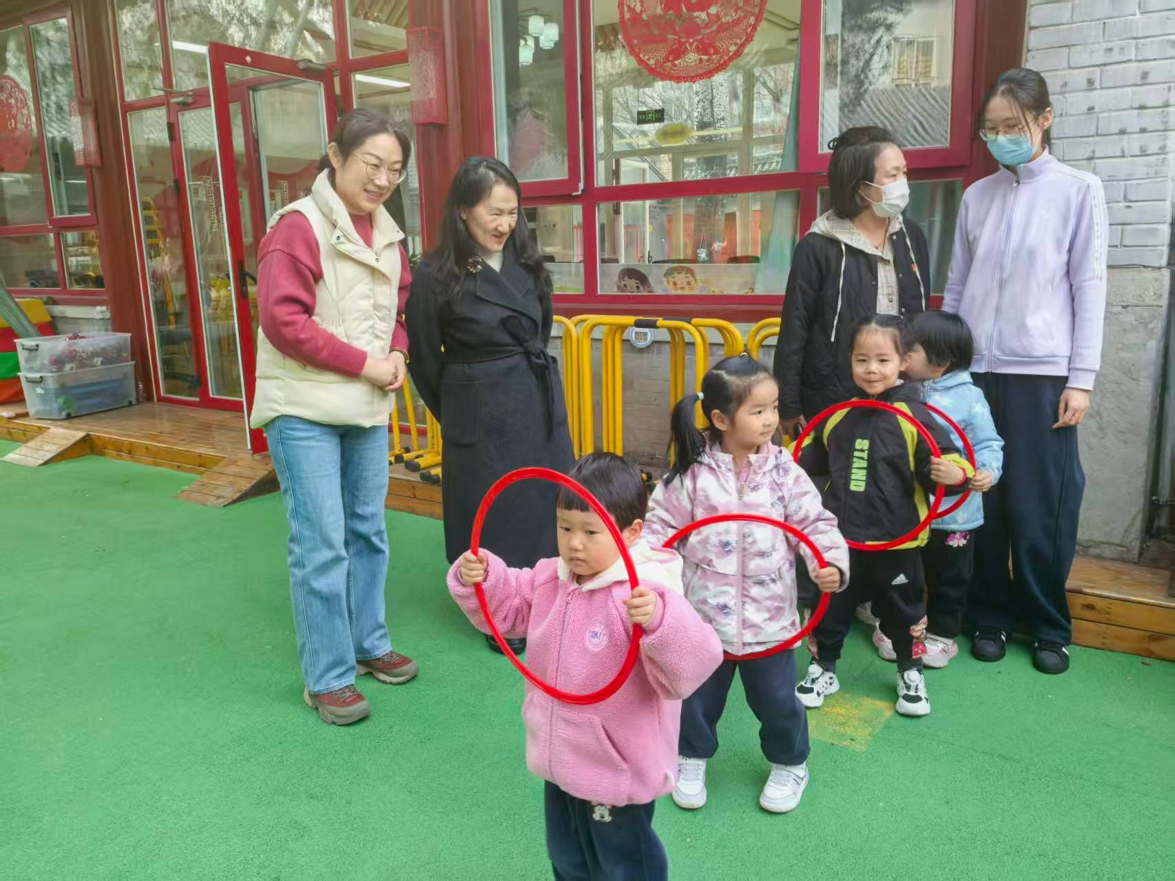 随后,大家一同来到户外活动场地,观摩孩子们的户外游戏。孩子们在钻爬、跳跃中尽显活力,这正是民大幼儿园深入贯彻落实习近平总书记关于“健康第一”教育理念的生动体现。我们通过“阳光体育”特色课程,让孩子在古老的庭院中释放活力,强健体魄,锤炼意志,将身心健康融入幼儿的一日生活,让“身上有汗、眼里有光”成为孩子们成长中最生动的模样。