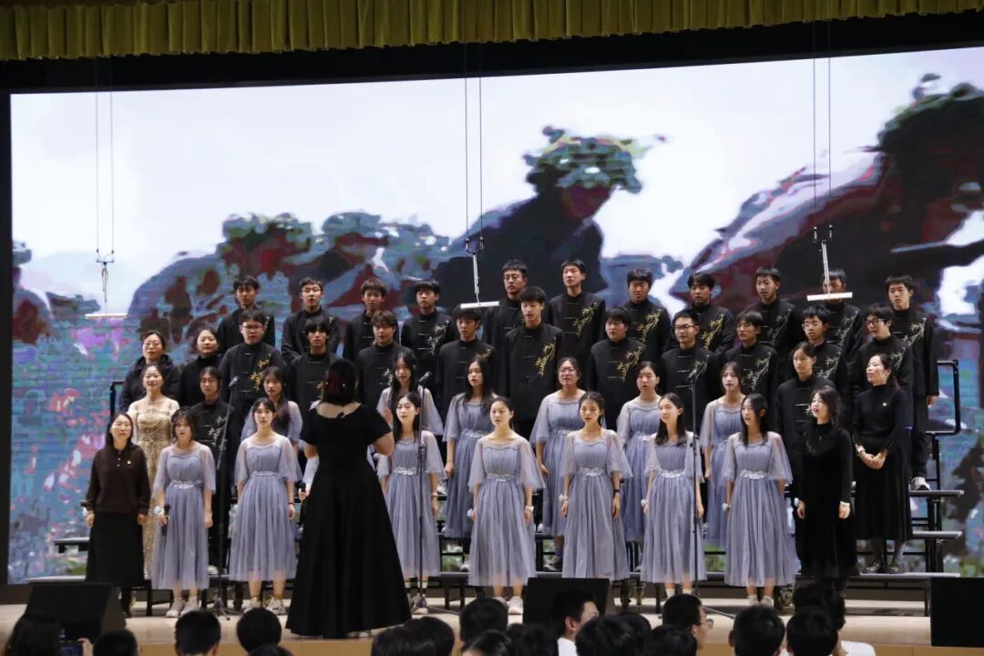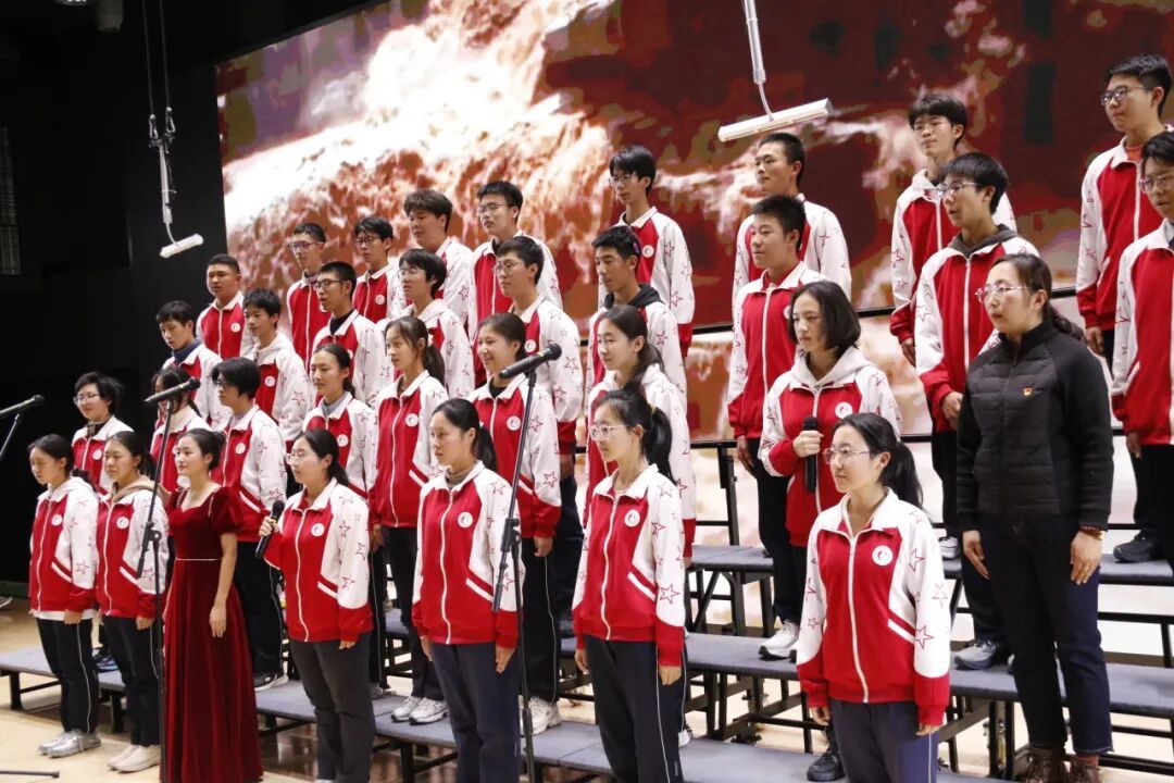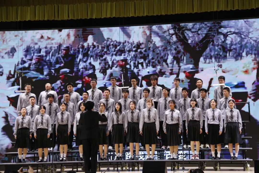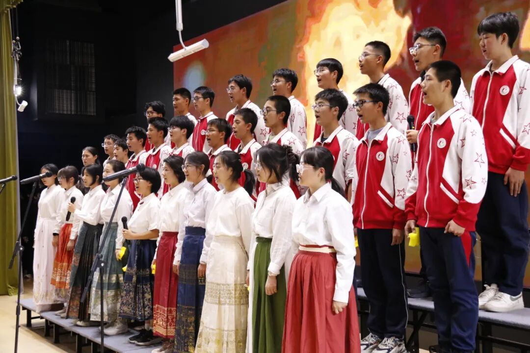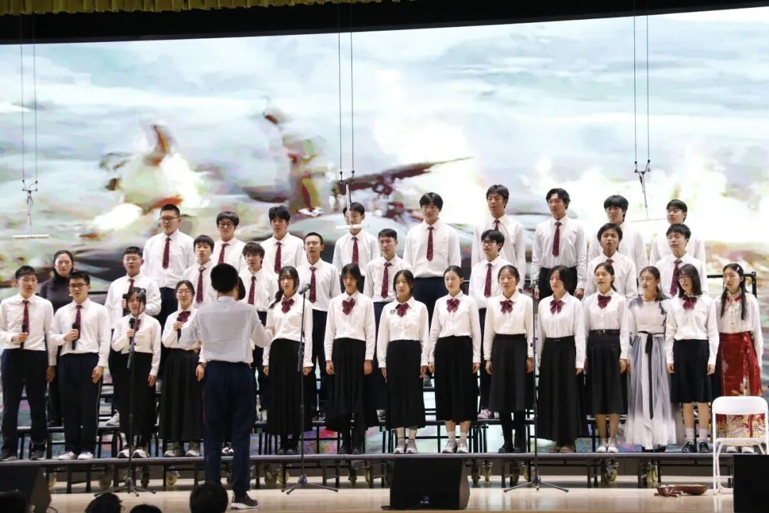 高一、高二年级各班分别演唱了经典必唱曲目《保卫黄河》。高中部、初中部各班以丰富的艺术形式与饱满的情感演绎自选歌曲,呈现了一场视听盛宴。