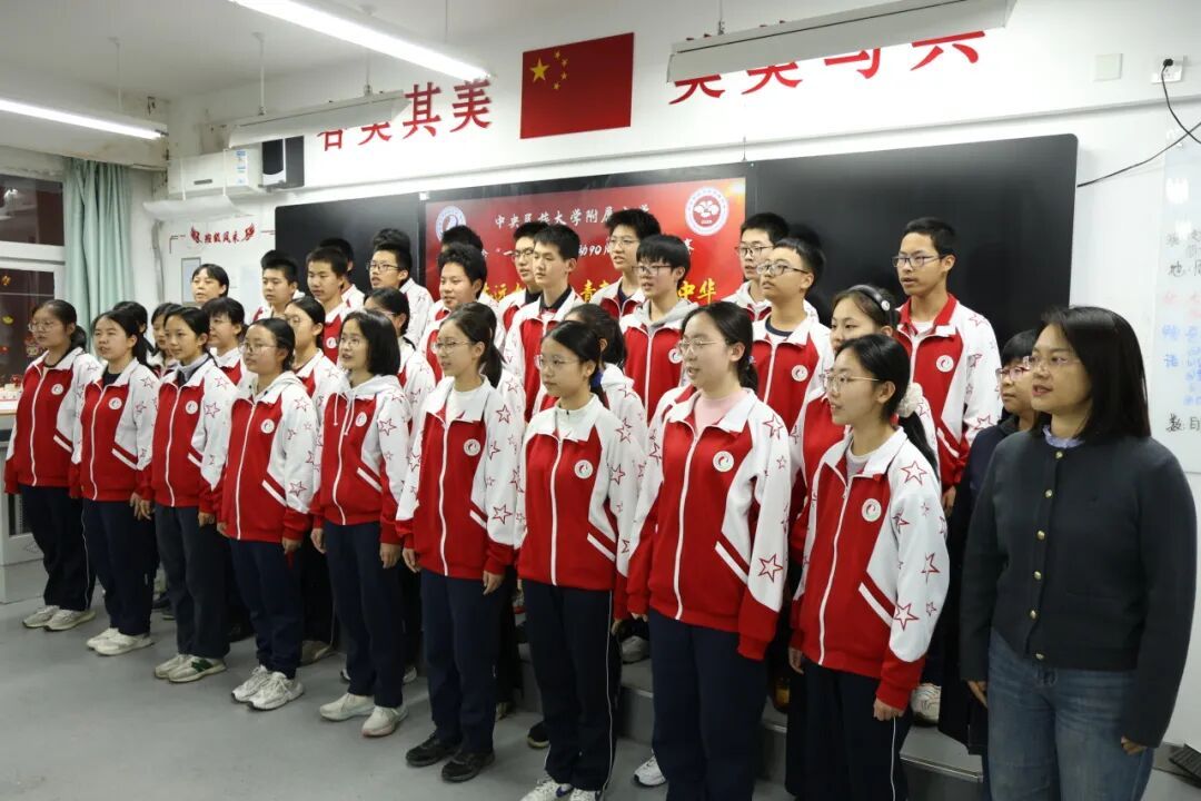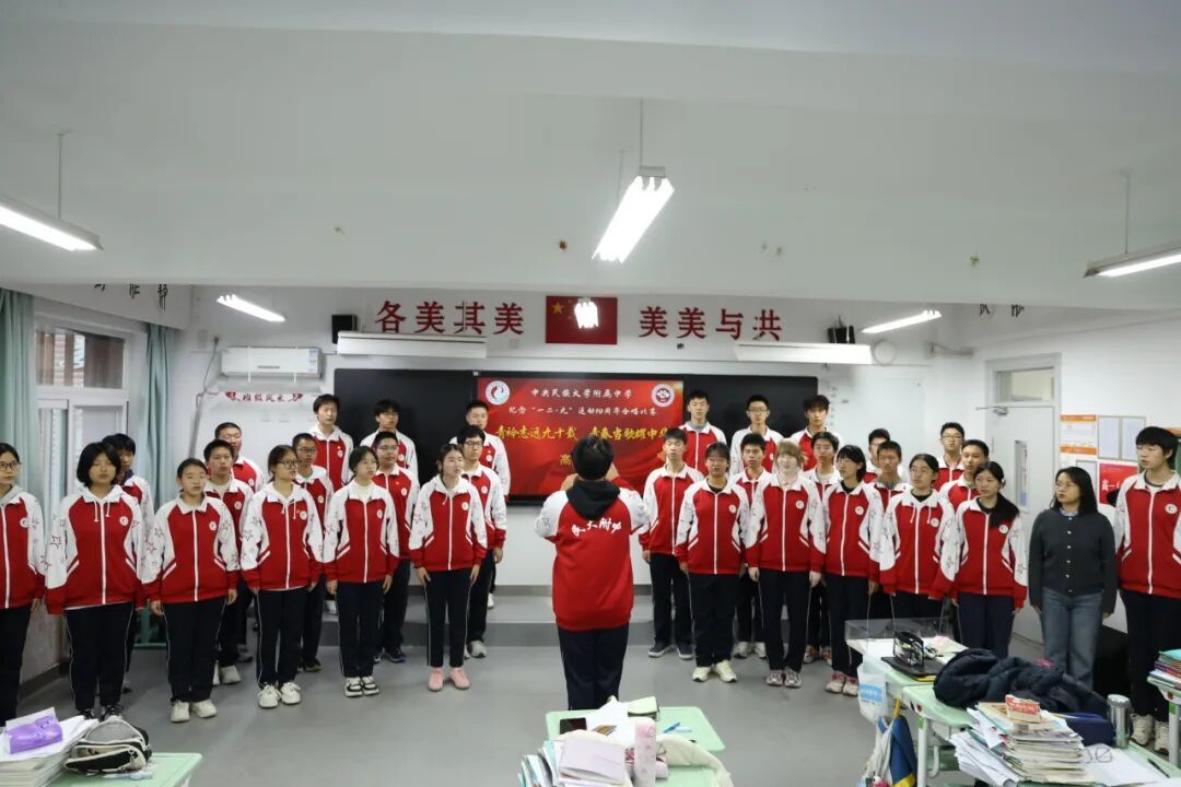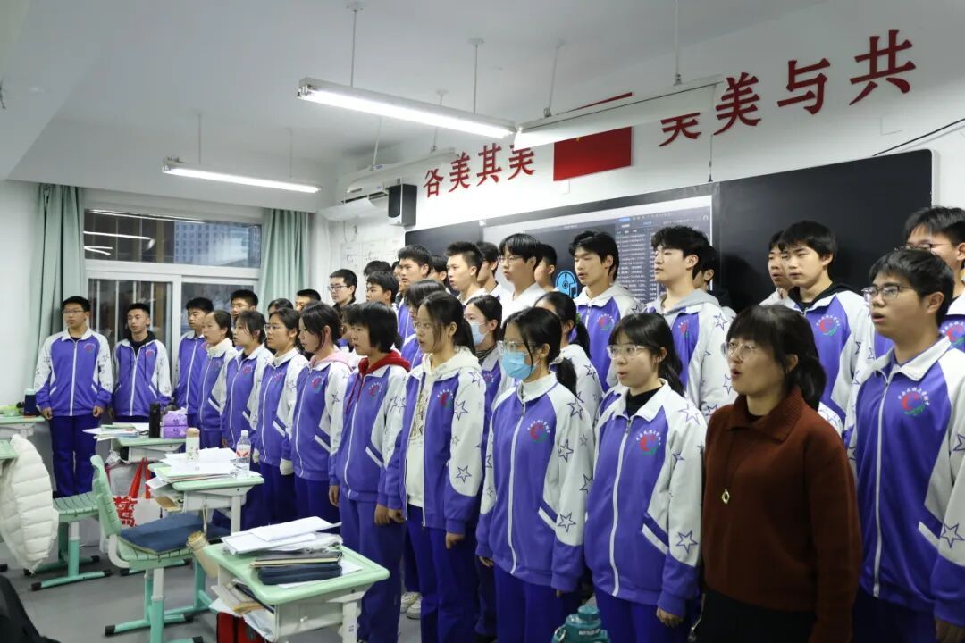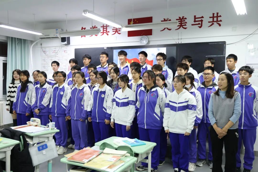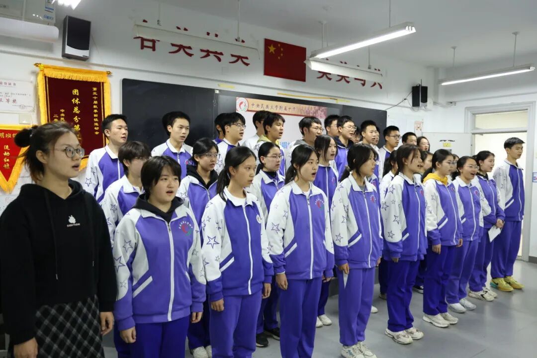 决赛前夕,同学们身着整齐校服,在教室里庄严肃穆唱响国歌与校歌《志在远方》,用真挚的歌声表达对祖国与学校的深情。