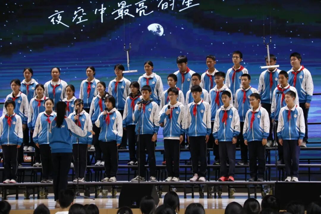 初二4班带来的《夜空中最亮的星》,轻唱出少年循先辈星光、以梦想续燃炬火的坚持。