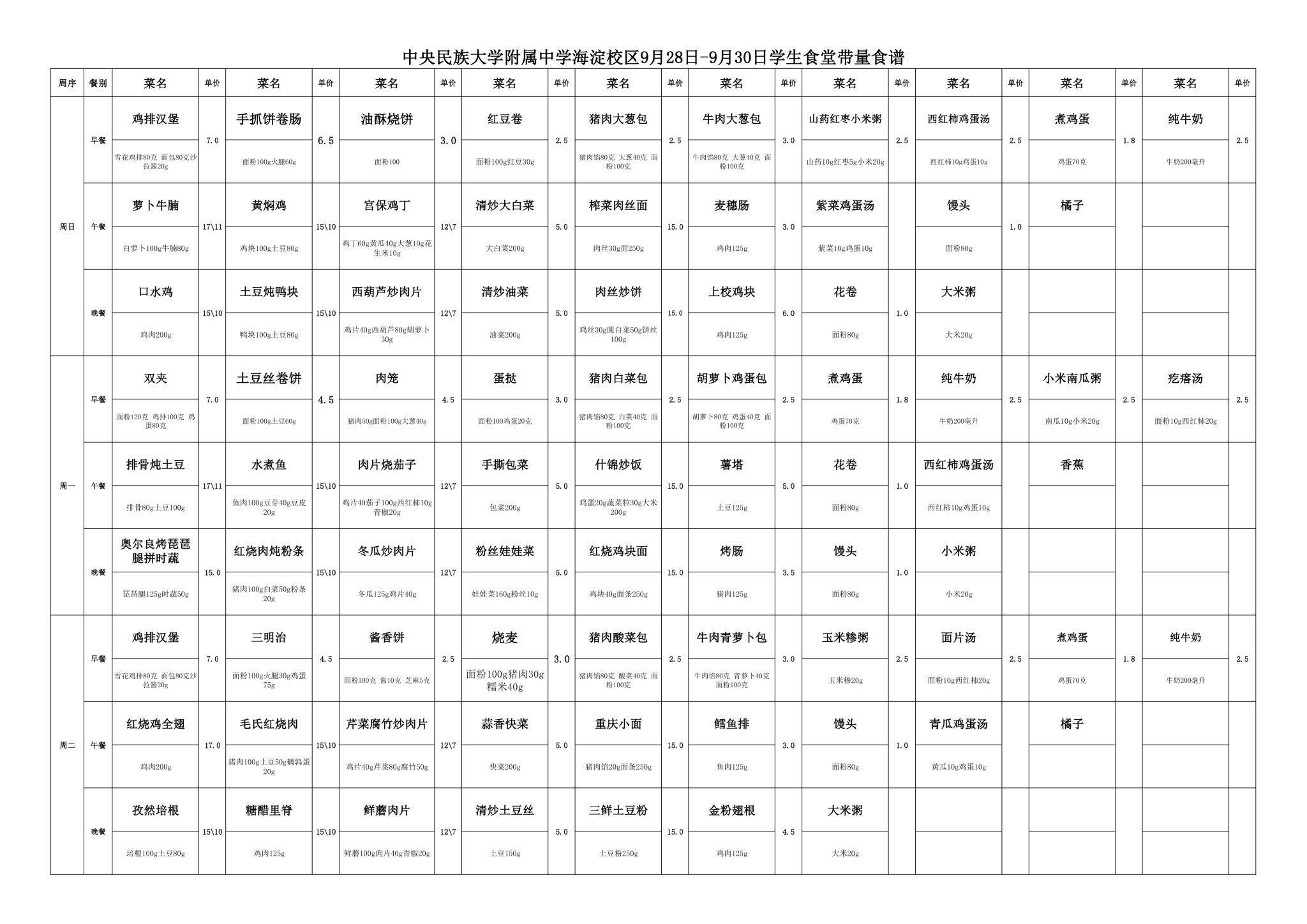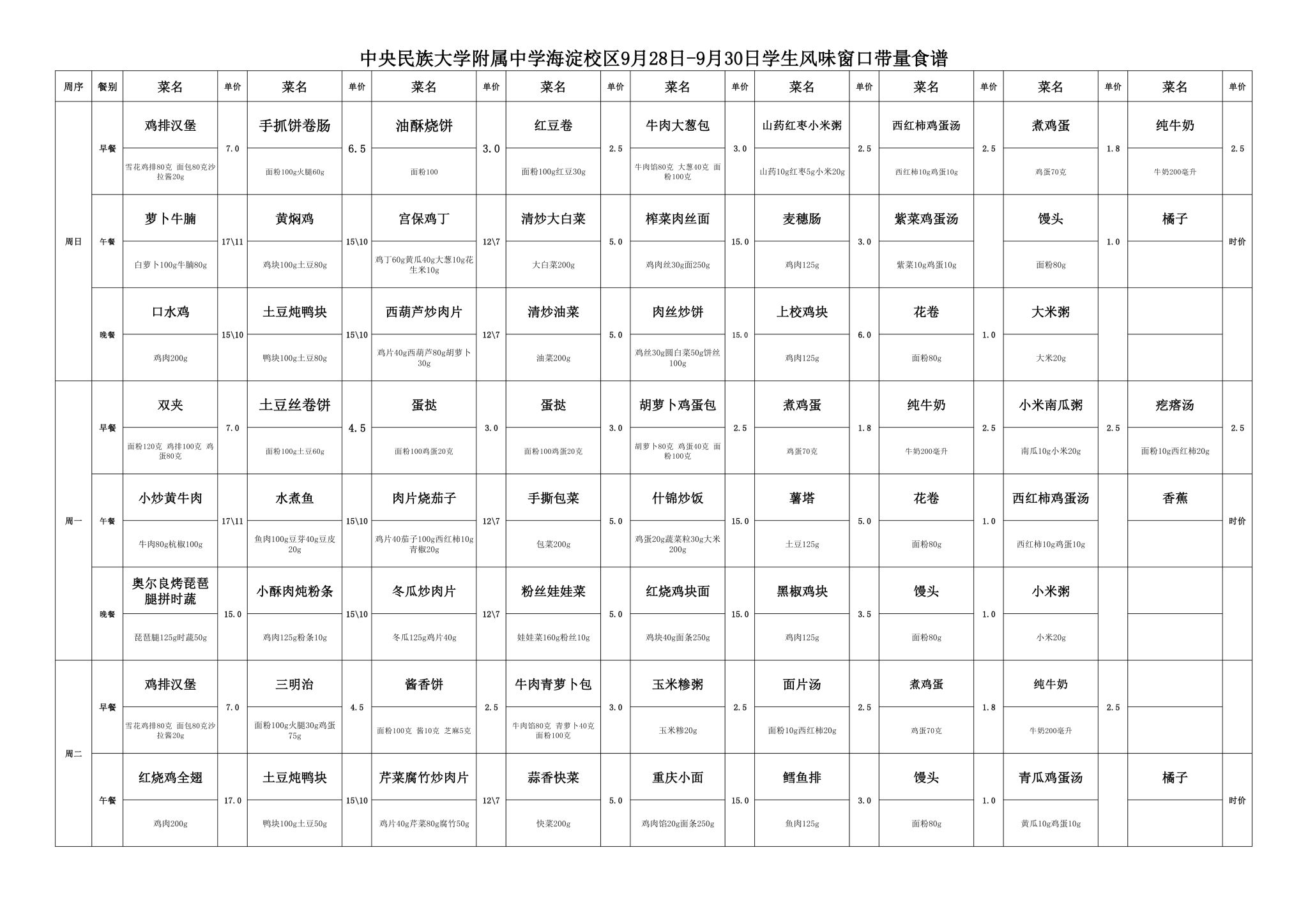 2025年秋季学期民大附中海淀校区学生食堂菜谱公示(2025.9.28-2025.9.30)
