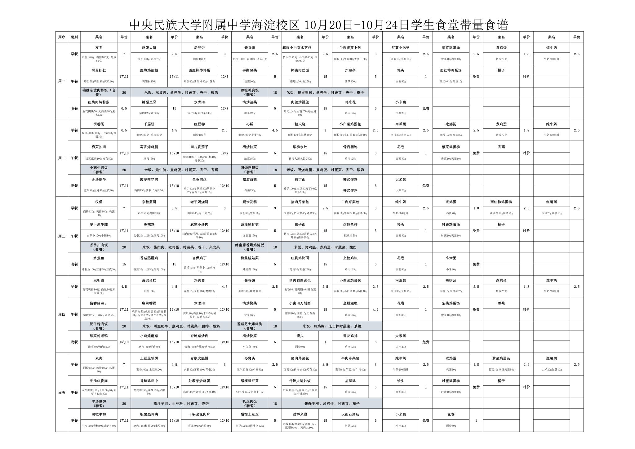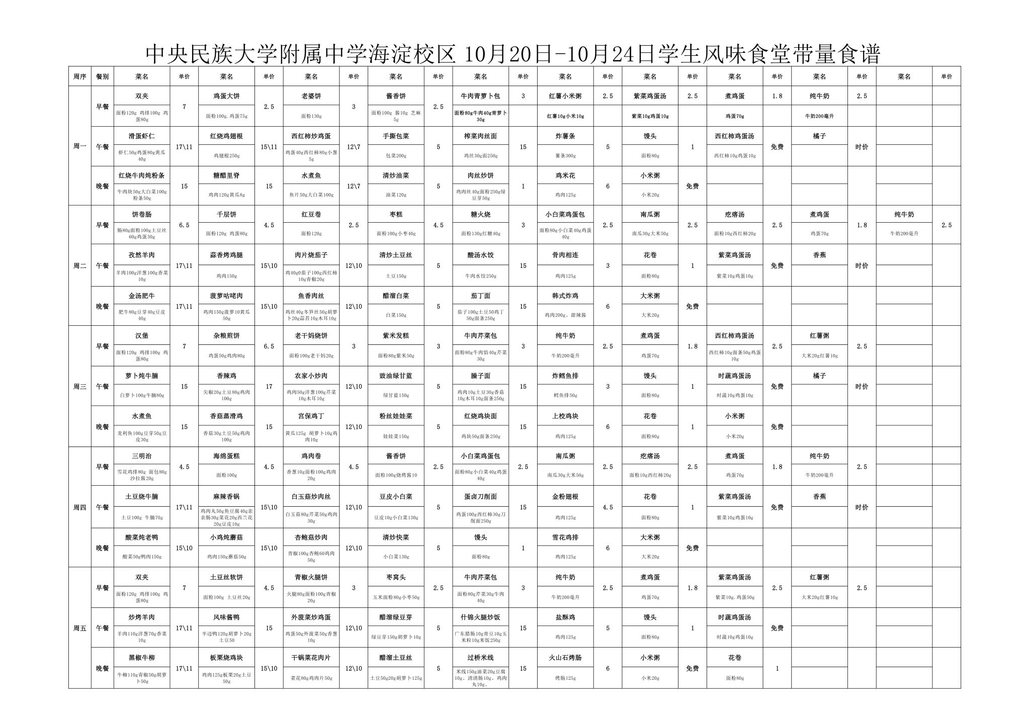 2025年秋季学期民大附中海淀校区学生食堂菜谱公示(2025.10.20-2025.10.24)