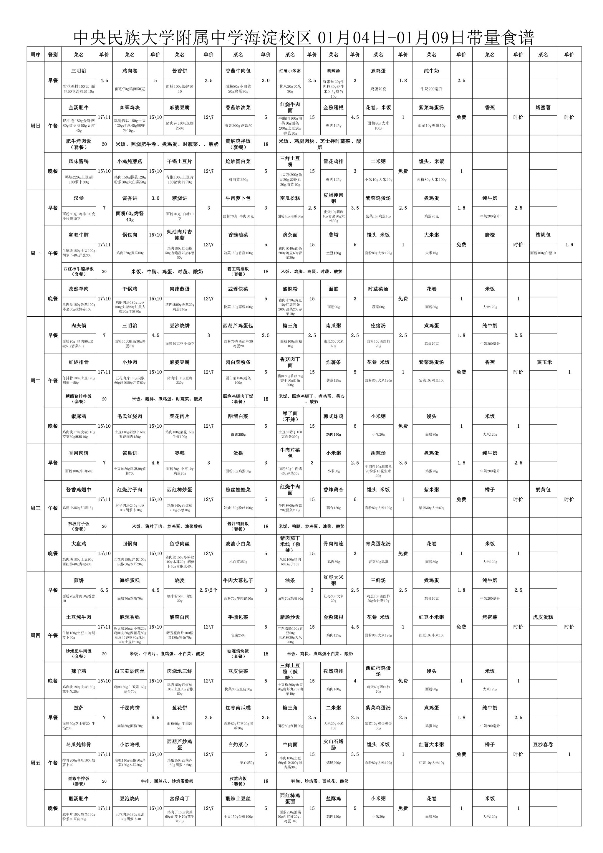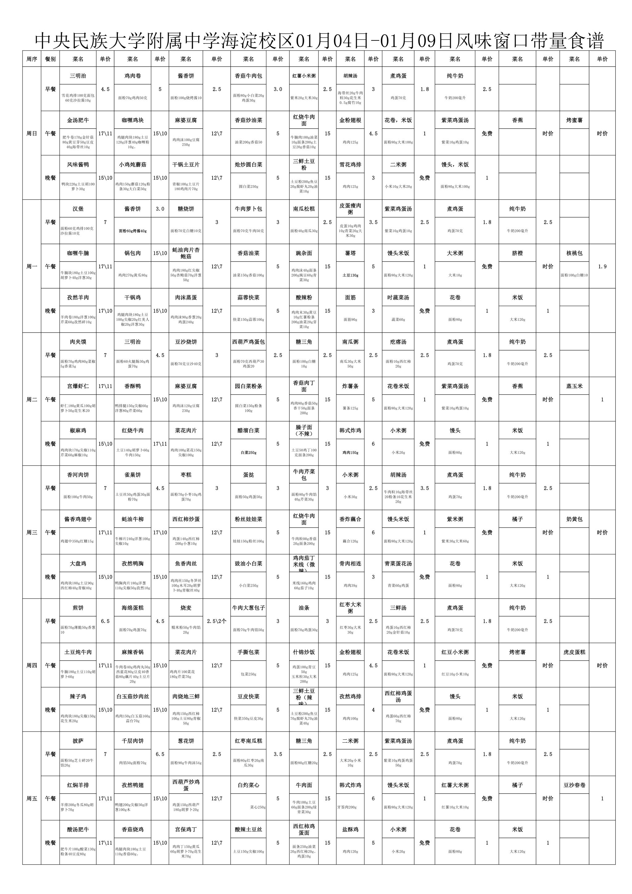 2025年秋季学期民大附中海淀校区学生食堂菜谱公示(2026.1.4-2026.1.9)