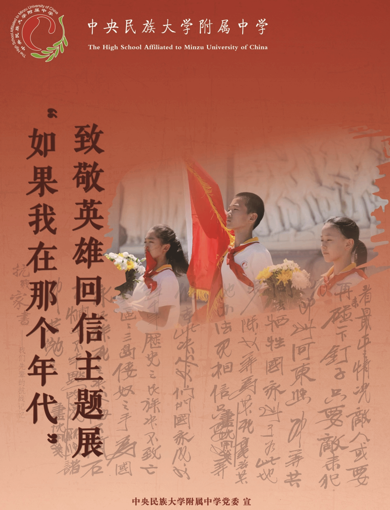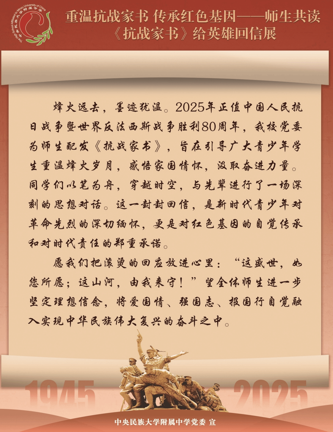 2025年正值中国人民抗日战争暨世界反法西斯战争胜利80周年,中央民族大学附属中学党委深度挖掘《抗战家书》的红色育人价值,精心构建了“主题授书—师生共读—观看回信展板”系列活动。活动伊始,校党委通过庄严的授书仪式奠定红色基调;继而组织师生共读,引导青年与革命先辈展开跨时空的心灵对话;最终以回信展板集中呈现学习成果,推动思想的深化与精神的传承。民大附中朝阳校区三个年级的党支部和校区团委积极响应活动号召,落实活动精神:以抗战先烈为楷模,激励学子坚定理想、勤学进取、勇担使命;既丰富校园文化,更让红色基因生生不息、薪火相传。始于家书传递,归于心田滋养,让伟大的抗战精神在知行合一中焕发时代光芒。
