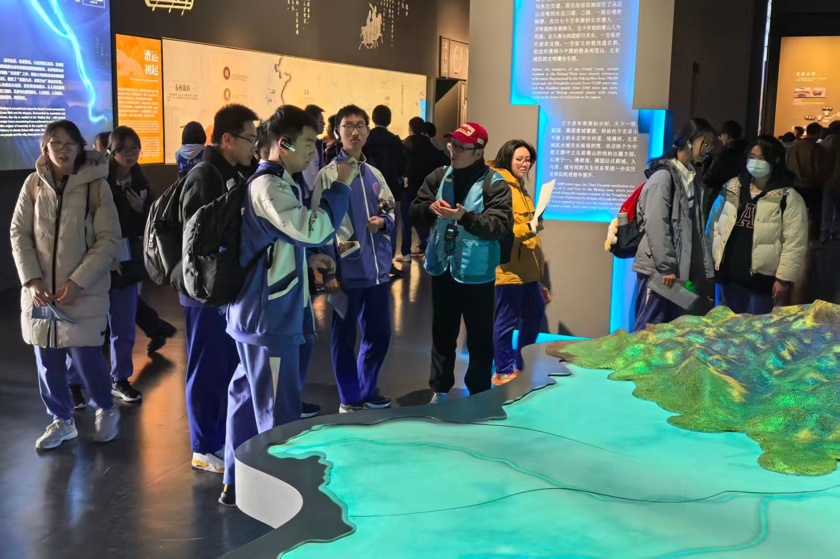 午后,师生们走进大运河博物馆,开启一场跨越千年的文化对话。在讲解员的引领下,大家认真聆听运河从邗沟初开至京杭贯通的演变历程,仔细端详景德镇窑青花瓷、漕运密符扇等珍贵文物,深入了解大运河作为“经济命脉、文化纽带”的历史价值。在“运河·不止”沉浸式体验区,裸眼3D技术重现了昔日帆樯络绎的漕运盛景,同学们仿佛置身古渡码头,直观感受南北交融的繁华景象。从博物馆的隔震技术到水利工程的智慧结晶,从文物背后的商贸故事到运河孕育的民俗文化,大家在聆听、观察与体验中,深刻领会了中华文明的博大精深。